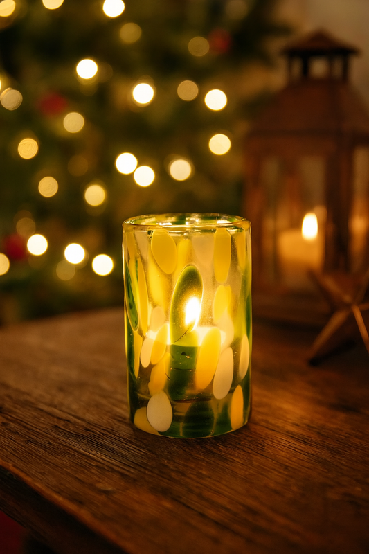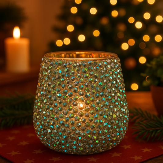 Theelichthouder glas met kralen multicolor/groen. (2de 30% korting)